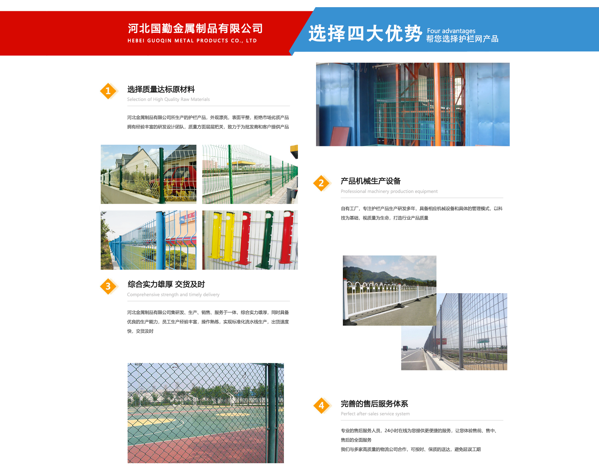 河北國勤金屬制品有限公司位于亞洲較大的絲網(wǎng)生產(chǎn)基地--享譽世界的“中國絲網(wǎng)之鄉(xiāng)”美譽的河北省安平縣境內(nèi)。主要是以研發(fā)設(shè)計、制造生產(chǎn)、銷售服務(wù)于一體的高科技現(xiàn)代化企業(yè)。河北國勤金屬制品有限公司主營產(chǎn)品有護欄網(wǎng),隔離網(wǎng),市政工程,草坪護欄等各種系列產(chǎn)品的制造廠家。我廠產(chǎn)品被廣泛應(yīng)用于公路、石化、化工、港口、合金、電力、造紙、鋼鐵、建材、市政、石油、污水處理及一般工業(yè)廠房、市政建設(shè)等各個領(lǐng)域。公司自成立以來一直為客戶提供優(yōu)良,貼心的服務(wù)。從售前售中售后我們都以客戶為導(dǎo)向,以設(shè)計先進、高科技手段、價格低質(zhì)量優(yōu)等多方面為客戶提供整體全面的服務(wù)。我們相信科技創(chuàng)新的力量,本廠在產(chǎn)品技術(shù)基礎(chǔ)上不斷探索與創(chuàng)新,力求以更高品質(zhì)的產(chǎn)品、更合理的價格、更完善的售后服務(wù)、不斷豐富的產(chǎn)品線滿足于每一位客戶的需求。